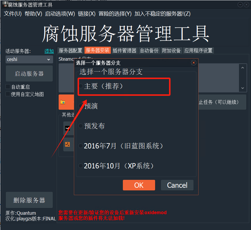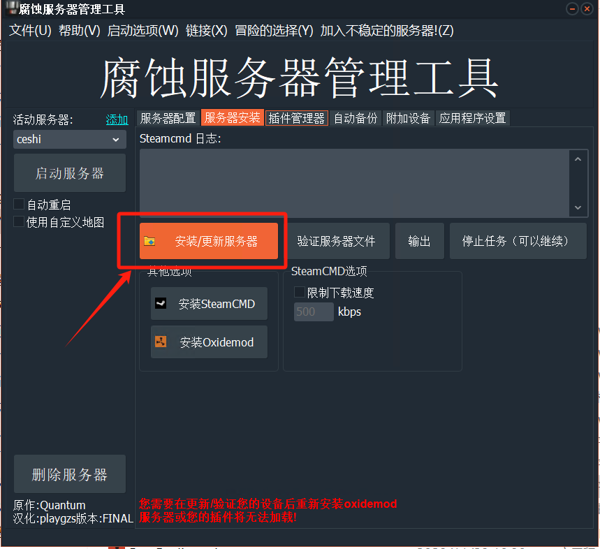 在黑色控制台输入quit关闭游戏服务器进程,然后进入打开RSM软件,点击“安装/更新服务器”,选择“主要(推荐)”点击OK,等待服务器更新