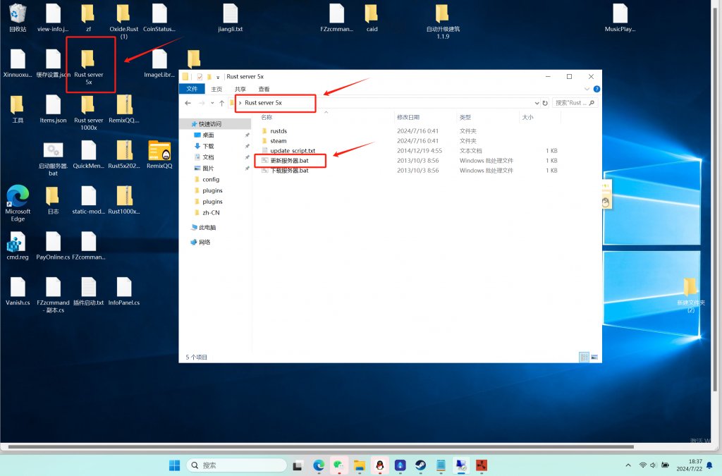 在正在运行的黑色控制台输入quit关闭游戏服务器进程,然后双击打开“Rust server 5x”文件夹下的“更新服务器.bat”文件进行更新Rust服务端,打开后会出现黑色的运行框,等待服务器更新完成后会自动关闭。